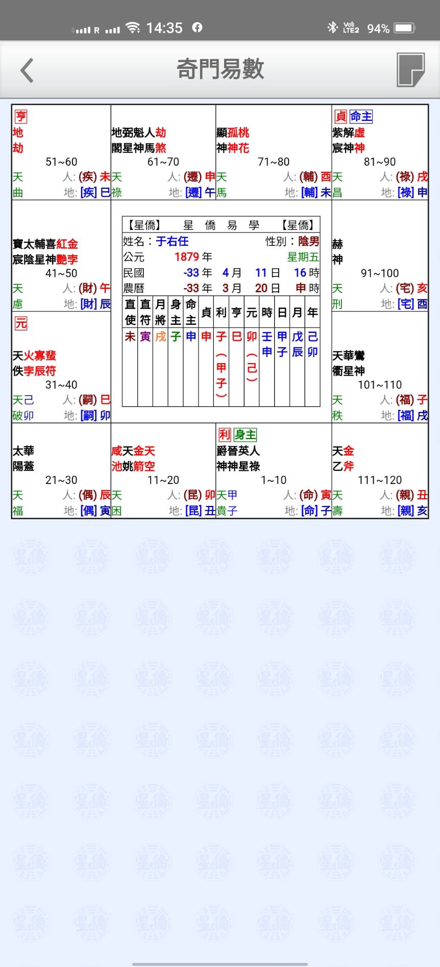 - 神煞 (共 39 顆: 天衢, 地閣, 天乙, 天德…天空, 地劫)