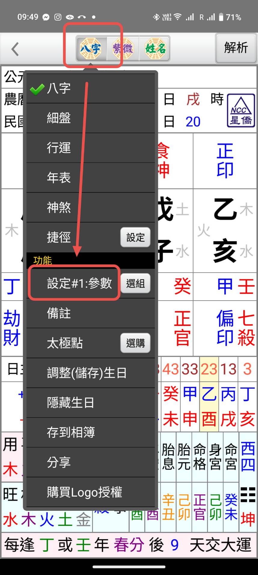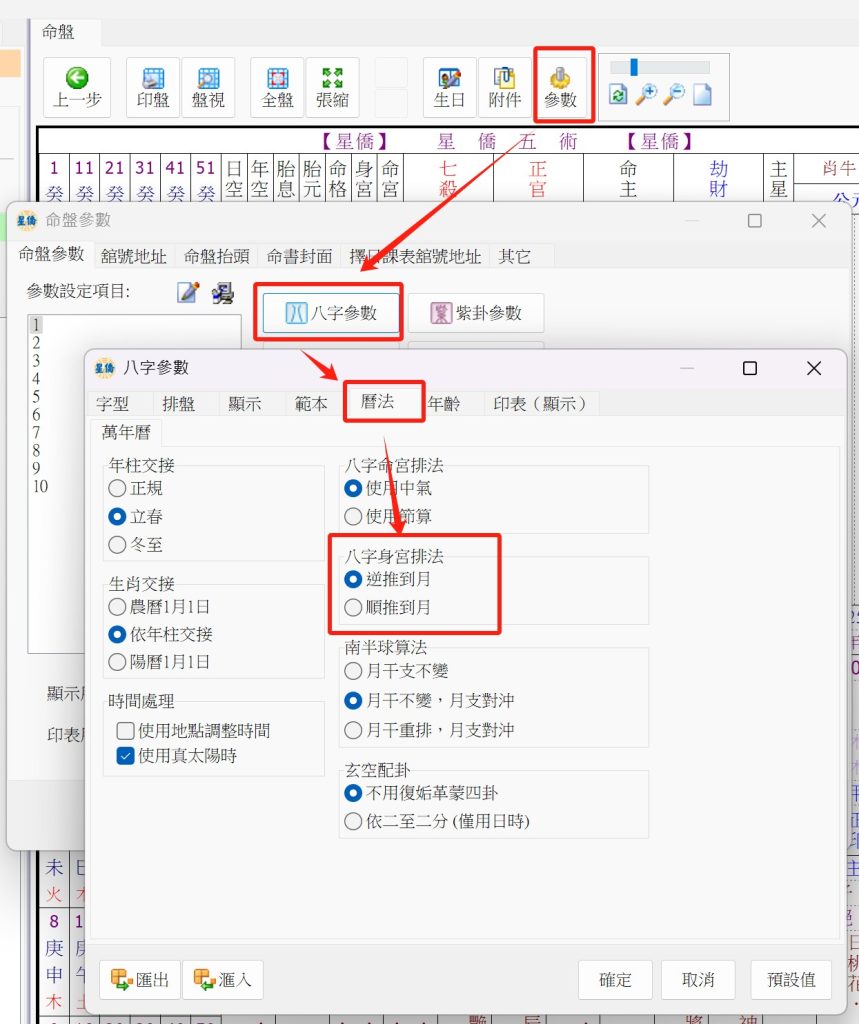 星僑八字論命身宮算法 發佈日期: 2023 年 11 月 18 日 作者: nccsoft 有客戶詢問八字資訊中的身宮算法為何 NCC-901 八字論命 2.778 版以後,在命盤中加了身宮顯示 NCC-A01 T01 M01 八字論命在最新版中也加入了身宮顯示 以下目前八字身宮的算法及出處 以上是我們找到的身宮排法出處,但有大陸客戶反應,他們的排法跟台灣的書相反,因此我們加了身宮排法的參數 NCC-900 Windows 電腦版設定方式如下: NCC-A00 T00 M00 設定方法如下: