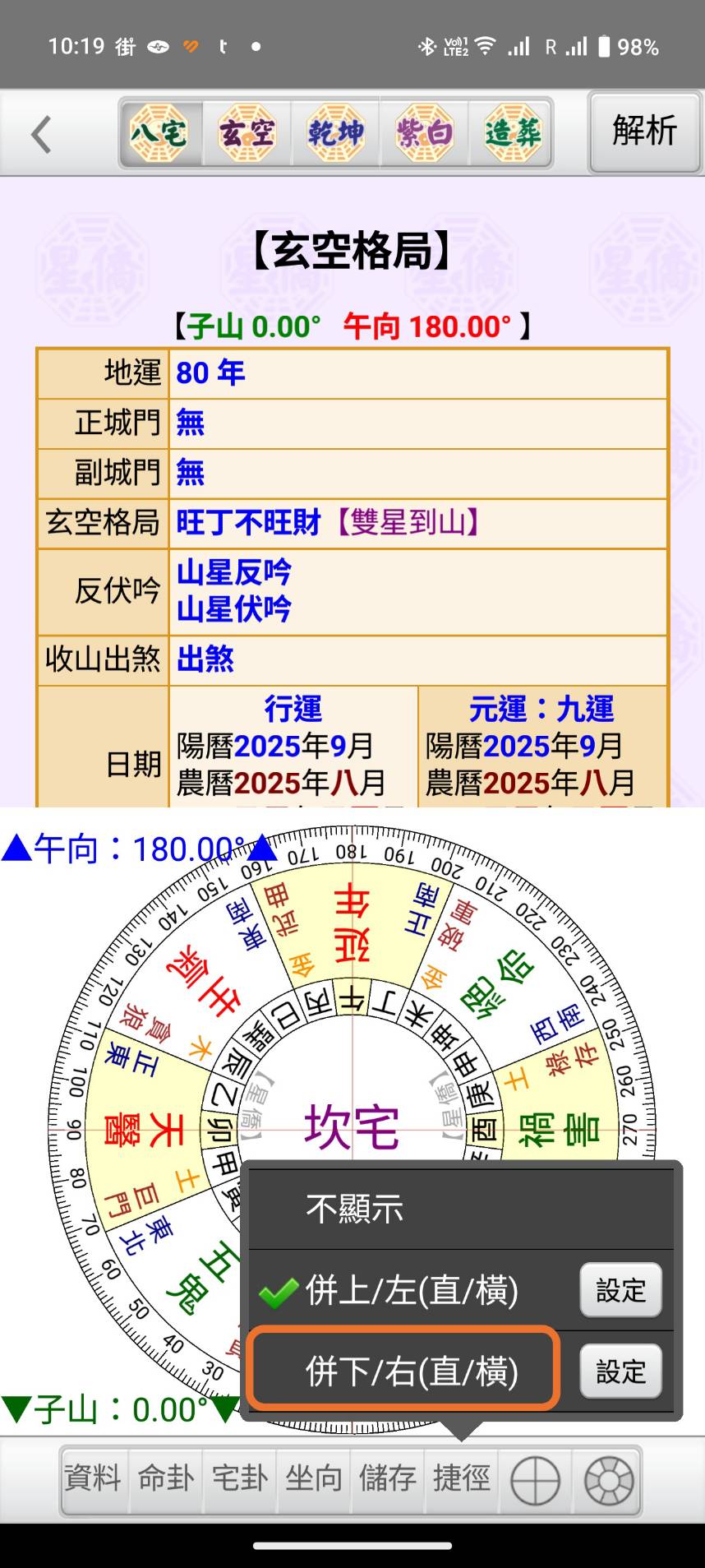 NCC-A00 T00 M00 風水類新增半頁捷徑功能 發佈日期: 2025 年 09 月 22 日 作者: nccsoft 有客戶詢問要如何看八宅風水是也可以看到到玄空格局,我們在風水類新增了半頁捷徑功能,這樣就可以在一個畫面同時看到八宅風水及玄空格局 點下面「捷徑」 選擇併上/左 或 併下/右 選擇捷徑項目 選擇併上/左捷徑內容就會出現在上面,橫式會在左邊 可以隨時切換顯示的方式 選擇併下/右,捷徑內容就會顯示在下面,橫式會顯示在右邊 捷徑內容可以任意選,只要有買的 app 解析項目都可以