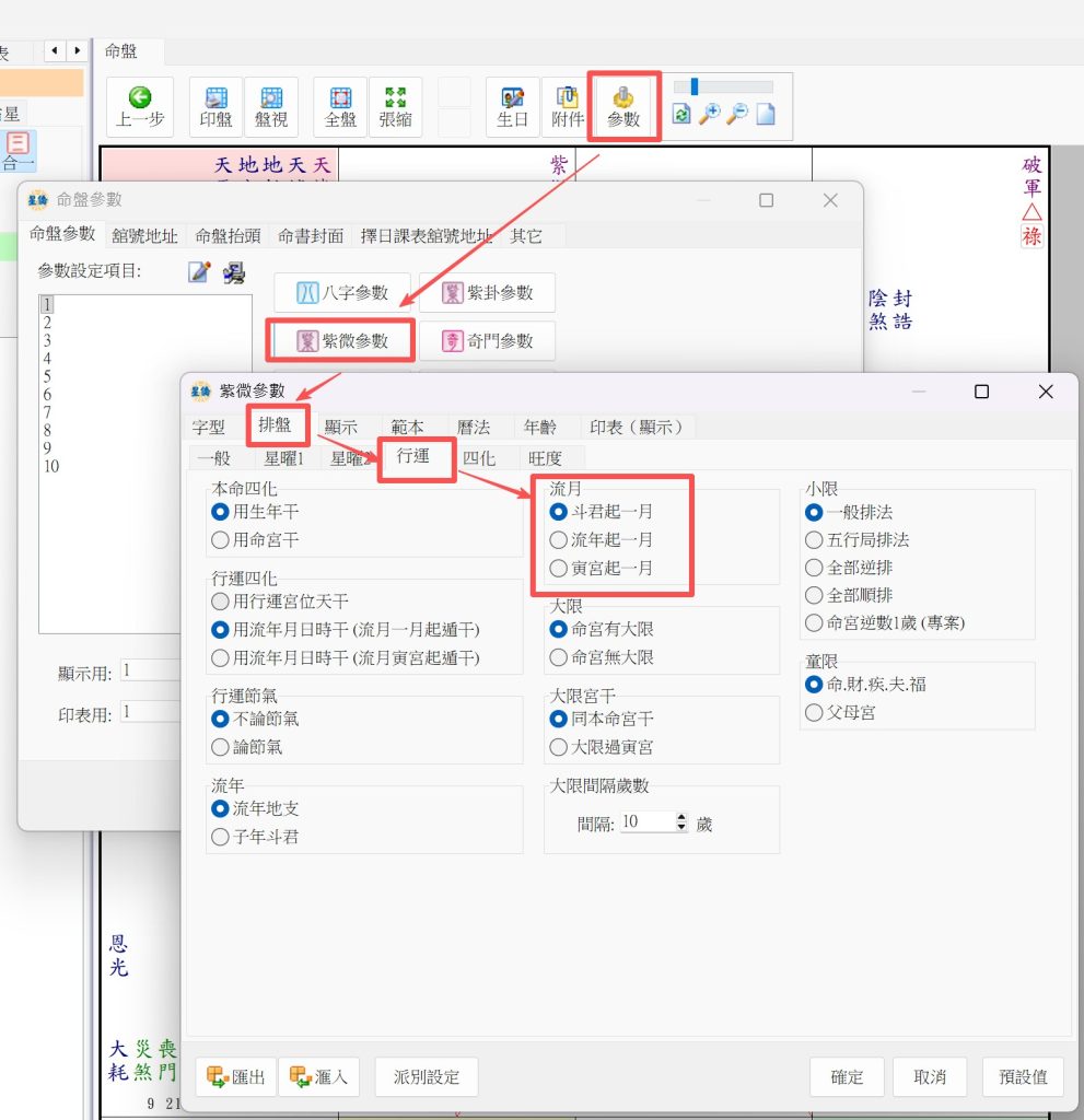 星僑紫微論命流月參數說明 發佈日期: 2025 年 09 月 24 日 作者: nccsoft 紫微斗數流月排法有不同的派別起法,目前我們提供3個流月參數讓客戶選擇,客戶可以到參數設定中自行設定,以下說明3穜方法的排法 NCC-A07 T07 M07 紫微論命 NCC-907 紫微論命 斗君起一月:這是紫微斗數全書中的排法,我們預設是用這個排法,用流年斗君起一月 流年起一月:用目前流年的命宮起一月 寅宮起一月:固定用寅宮起一起